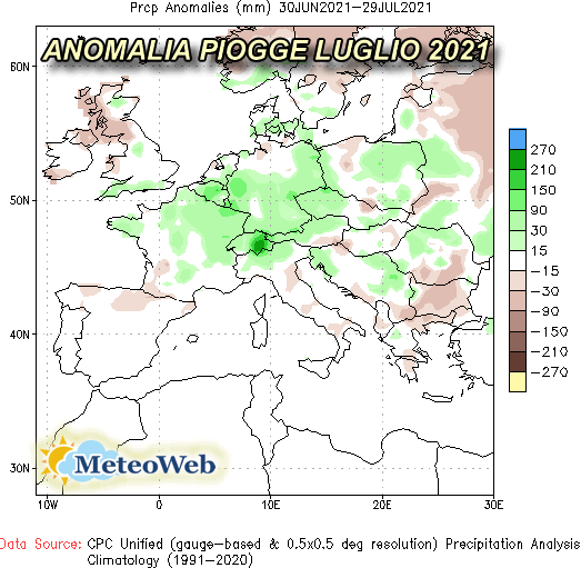 Le anomalie più fresche, aree blu nell’immagine in evidenza riguardano, in particolare, la Francia, il Portogallo e la Spagna centro-occidentale. Relativamente all’Italia, si sono avute fasi di caldo importante con valori abbondantemente sopra i 40°C su diverse aree meridionali; caldo persistentemente sopra la norma anche sulle regioni adriatiche tutte, sull’Emilia-Romagna e sulle aree estreme di Nord Est. Sulle regioni tirreniche, soprattutto centro-settentrionali, e sulle aree centro-occidentali del Nord, il quadro termico è evoluto sostanzialmente nella norma, anche con alcune aree dove i valori si sono attestati sotto la norma, in particolare tra il Piemonte orientale, meridionale e l’Ovest/Nordovest Lombardia. In riferimento alle piogge, anomalia pluviometrica immagine interna NOAA, è evidente un surplus su tutta l’Europa centrale, in particolare sull’area elvetica e nostri settori alpini centrali di confine, colorazione verde più scuro, ma pioggia sopra la norma anche tra Piemonte centro-settentrionale, Lombardia e Trentino. Sul resto dell’Italia, piogge in prevalenza nella norma, salvo deficit sull’Emilia-Romagna centro-orientale, sul Nord Appennino, localmente tra Lazio e Abruzzo e tra Campania, Lucania e Puglia centrale. Le piogge in buona parte nella norma sull’Italia centro-meridionale, aree in bianco, sono state determinate essenzialmente da una fase più perturbata accorsa tra metà mese e il 20, fase in cui su molti settori ci sono state occasioni per accumuli intorno ai 30/40/70/100 mm, accumuli che sostanzialmente costituiscono la media tipica del mese di luglio. Per il resto del mese, invece, vi sono state opportunità di piogge sulle aree settentrionali, specie di nordovest, alpine e prealpine, scarsi fenomeni, invece, al Centro Sud.