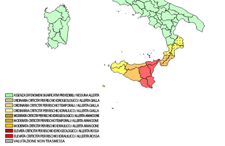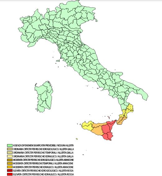Sulla base dei fenomeni previsti e in atto è stata valutata per la giornata di domani, venerdì 29 ottobre, allerta rossa su parte della Sicilia, allerta arancione sui settori meridionali della Calabria e su settori della Sicilia e allerta gialla sulle restanti aree della Sicilia e sulle zone centrali della Calabria.