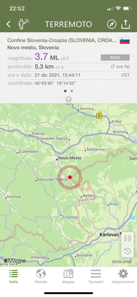 Una scossa di terremoto di magnitudo 3.7 si è verificata nel pomeriggio di oggi, alle 15:44, al confine tra Slovenia e Croazia, ad una profondità di 5,3 km. L’epicentro è stato individuato a Nove Mesto, in Slovenia.