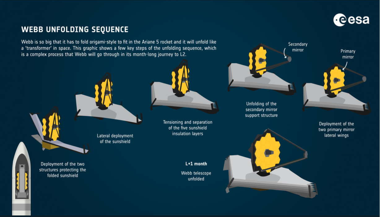 Le due ali dello specchio primario di Webb erano state piegate per adattarsi all’interno del cono di un razzo Arianespace Ariane 5 prima del lancio, avvenuto il 25 dicembre dalla Guyana francese. Dopo più di una settimana di altri dispiegamenti critici, il team Webb ha iniziato a dispiegare a distanza i segmenti esagonali dello specchio primario, il più grande mai lanciato nello spazio. Questo è stato un processo che è durato più giorni, con la prima parte schierata il 7 gennaio e la seconda l’8 gennaio. Il controllo a terra del Mission Operations Center presso lo Space Telescope Science Institute di Baltimora ha iniziato a dispiegare il secondo pannello laterale dello specchio alle 8:53 EST. Una volta disteso e agganciato in posizione alle 13:17 EST (le 19:17 italiane), il team ha dichiarato che tutti i principali dispiegamenti sono stati completati con successo.