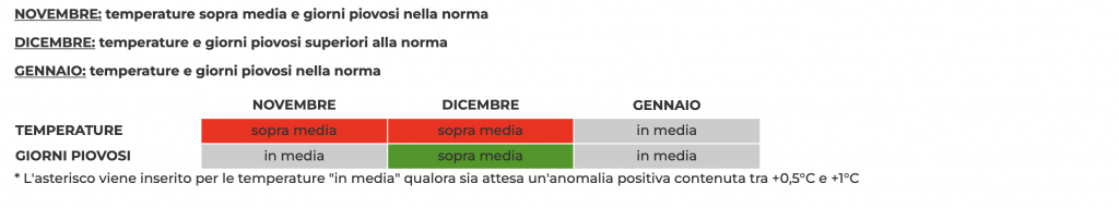 “Mentre a novembre le precipitazioni saranno nella media stagionale, dicembre sarà molto più piovoso,” ha spiegato Gozzini. A gennaio 2023 si prevedono invece temperature e piogge nelle medie stagionali.