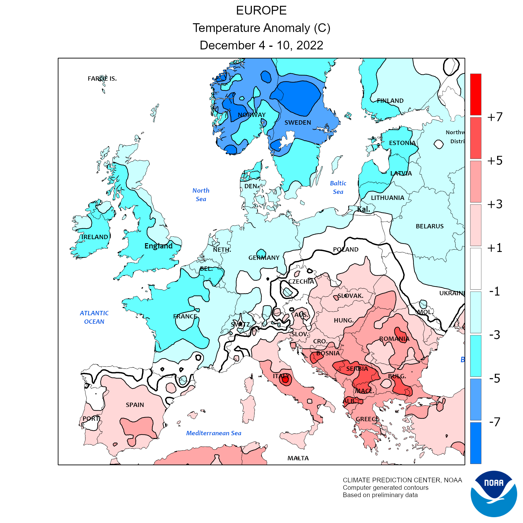 Il mese di Dicembre 2022 è trascorso con enormi anomalie termiche in Europa: eccessi clamorosi e opposti per il grande freddo della prima metà del mese e il caldo record delle ultime due settimane. La sintesi di un mese così estremo è sintetizzata egregiamente nelle tradizionali mappe delle anomalie termiche settimanali fornite dal NOAA, che evidenziano con una colorazione estrema questi estremi climatici così significativi.