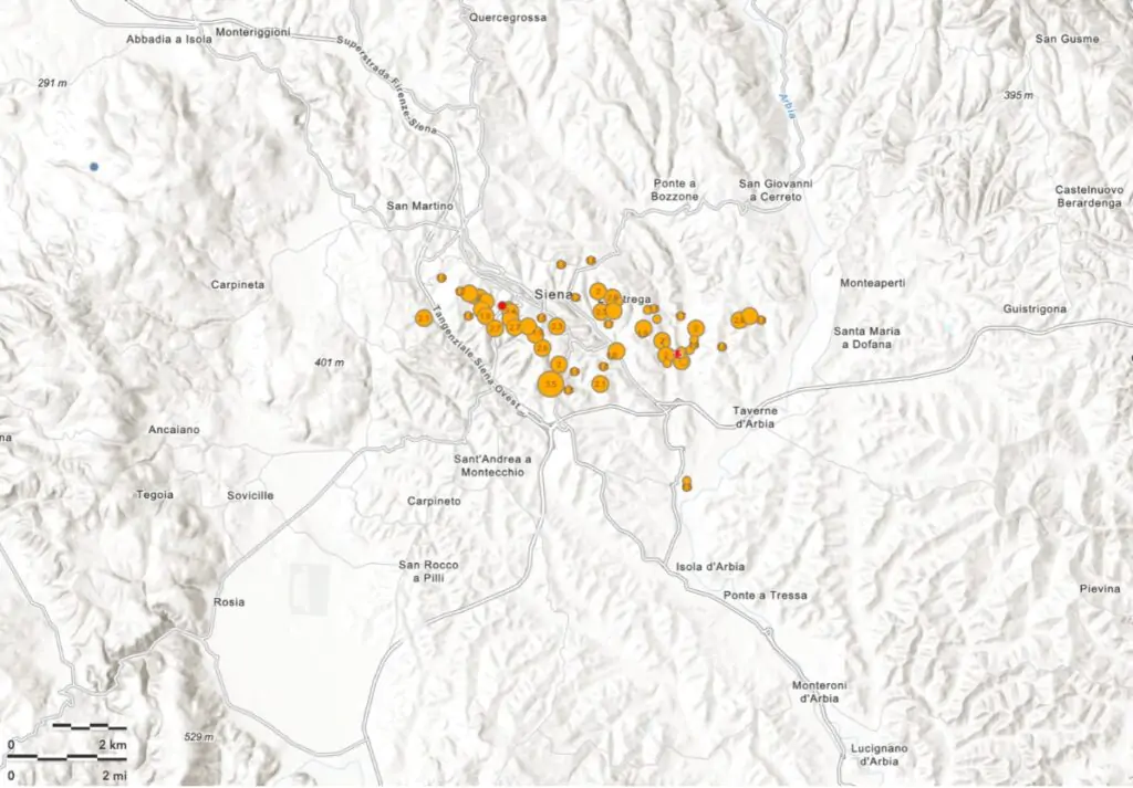 Siena ha una lunga storia di terremoti, quasi tutti localizzati sotto la città e documentati fin dal 1320; il più recente risale al 1956, sotto una grande nevicata. Il terremoto dell’8 febbraio, dunque, “è un evento in linea con le caratteristiche sismiche di Siena, che conosciamo da molto tempo”, ha detto il sismologo Carlo Meletti, dell’Istituto Nazionale di Geofisica e Vulcanologia (INGV). “Siena – ha proseguito – è la città che, per motivi storici, ha la più lunga storia sismica documentata. La prima testimonianza risale infatti al 1320 e da allora sono state oltre le 170 notizie di sismi risentiti nella città”. Tutti i terremoti, ha aggiunto, “sono stati localizzati sotto la città”, ma raramente hanno provocato danni. L’ultimo terremoto importante, di magnitudo 4, risale al 1956 ed era stato avvertito come un sesto grado della scala Mercalli, arrivò durante una grande nevicata e le persone che lasciarono le loro case rimasero tutta la notte nella neve.