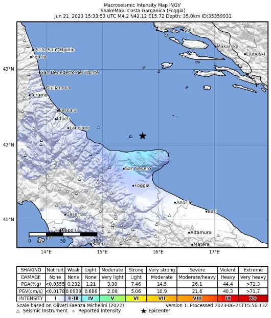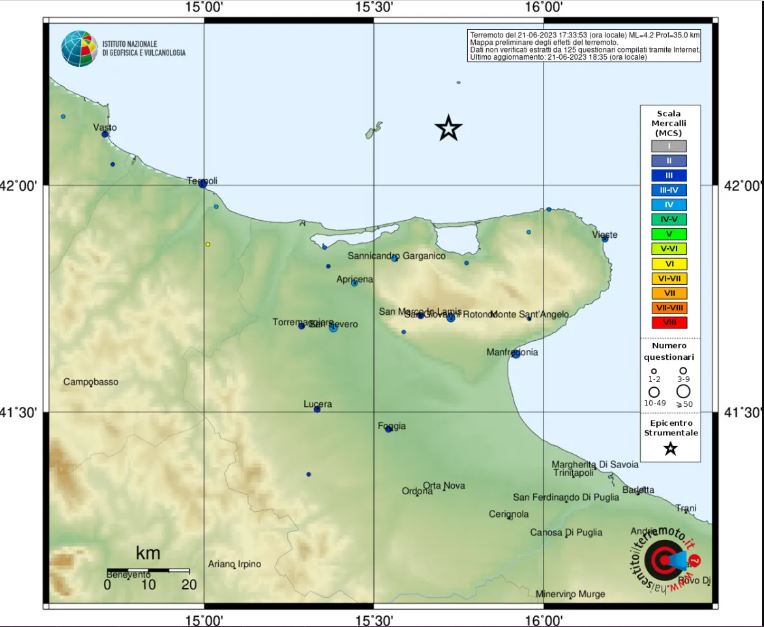 Forte scossa di terremoto nell’Adriatico. Alle 17:33 di oggi, mercoledì 21 giugno, si è verificato un terremoto di magnitudo 4.2, con epicentro vicino alle Isole Tremiti. Il sisma è avvenuto ad una profondità di 35km ed è stato distintamente avvertito in tutto il Gargano e nel resto della Puglia. La scossa è stata distintamente avvertita anche in Abruzzo e Molise. Ai piani alti dei palazzi in Molise è tremato il mobilio. “È stata lunga e sussultoria“, hanno detto alcuni residenti di Termoli. Non si registrano, fino a questo momento, problemi o danneggiamenti.