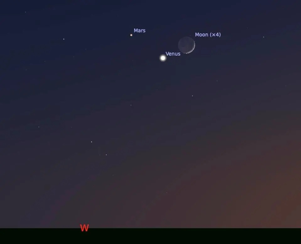 Il Solstizio d’Estate – il giorno più lungo e la notte più breve dell’anno – si verifica esattamente alle 16:57 ora italiana e significa anche zero oscurità astronomica per le latitudini settentrionali e una notte breve per l’intero emisfero settentrionale. Tuttavia, semplicemente guardando a Ovest poco dopo il tramonto mercoledì sera, potrete vedere una bellissima Luna crescente illuminata al 13% accanto al luminoso pianeta Venere. La parte oscura del satellite brillerà grazie all’ “Earthshine“. Appena sopra la coppia ci sarà il Pianeta Rosso Marte, formando un bel triangolo celeste.