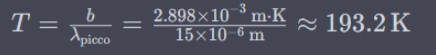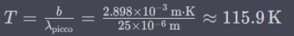 dove λpicco è la lunghezza d’onda di picco dell’emissione termica, T è la temperatura assoluta in °kelvin e “b” è la costante di proporzionalità di Wien, che ha un valore di circa 2.898×10−3 m∙K. Per una lunghezza d’onda di 25 micron (25 \times 10^{-6} m), possiamo calcolare la temperatura: