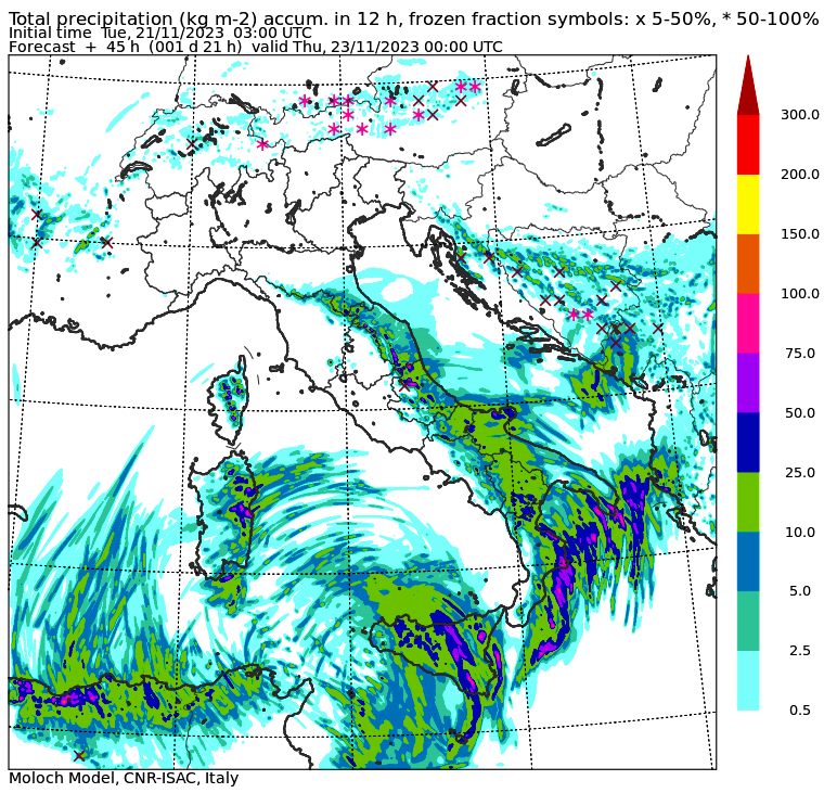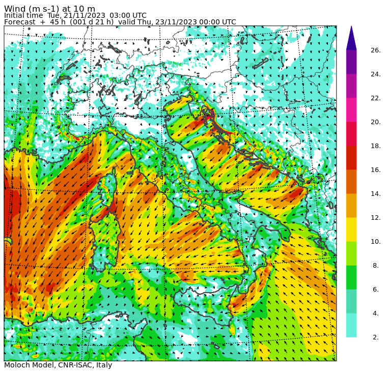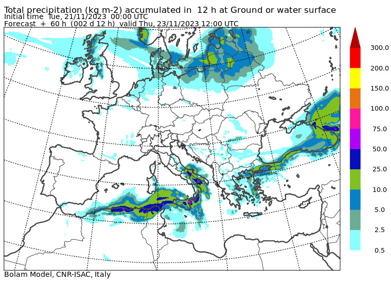 Ma il giorno peggiore in termini di maltempo sarà dopodomani, giovedì 23 novembre. Il ciclone sul Canale di Sicilia alimenterà temporali violenti e persistenti su tutta la fascia jonica, dal Golfo di Taranto alla Sicilia. E’ alto il rischio di alluvioni su Calabria e Sicilia orientali, dove c’è il rischio di oltre 300mm di pioggia in poco più di 24 ore. Le temperature diminuiranno ma non molto: nelle ore diurne complice il maltempo farà più fresco, ma comunque saremo sempre sopra la norma del periodo con temperature minime mai sotto i +13/+14°C sulle coste del meridione. Questo caldo anomalo potrebbe determinare fenomeni estremi ancora più intensi. Massima attenzione.