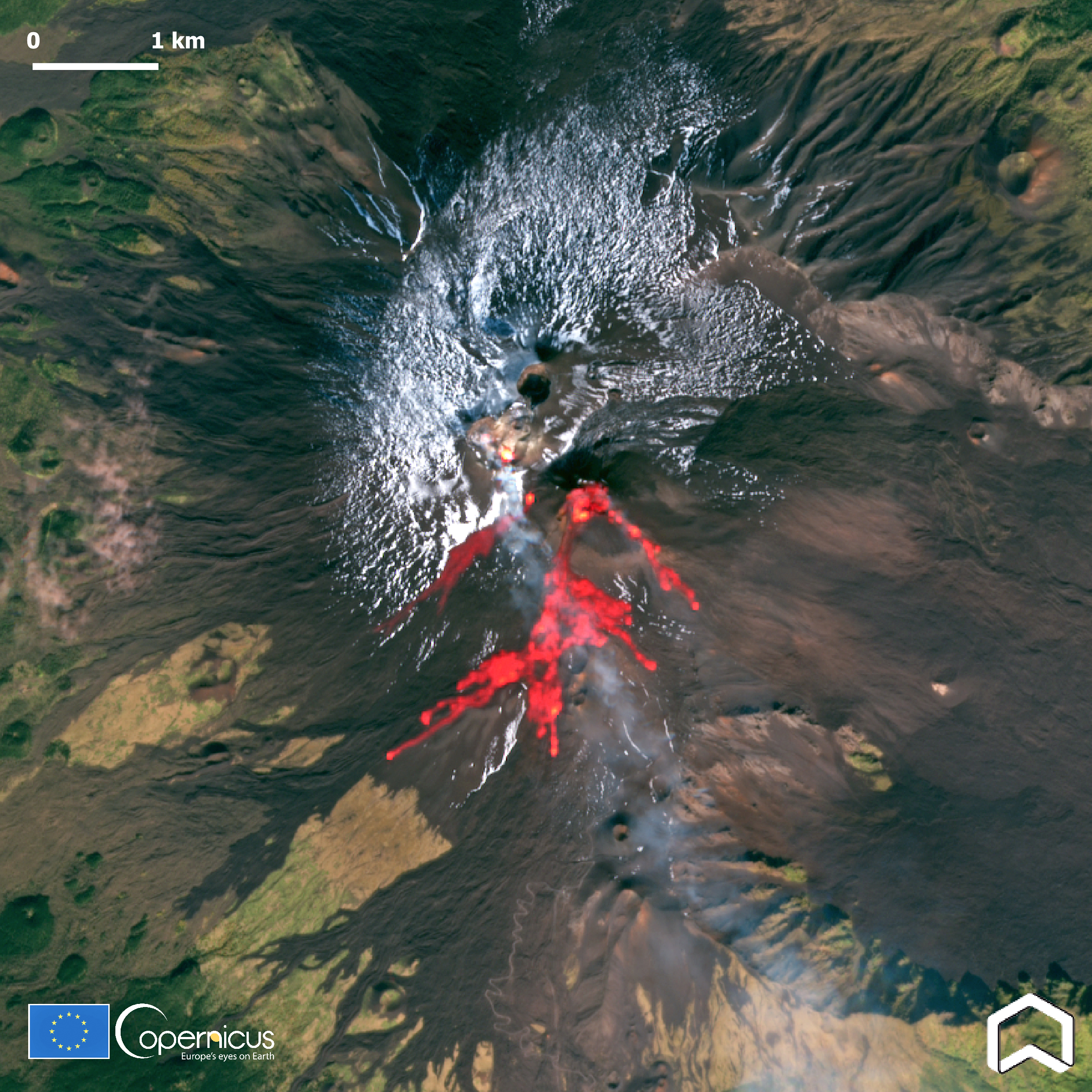 Il 12 novembre, l’Etna ha dato origine al terzo parossismo del 2023, con fontale di lava, boati e ricadute di cenere su alcune località vicine. Se per noi sulla Terra lo spettacolo è stato in parte oscurato dalla presenza di nubi basse, una vista privilegiata l’hanno avuta i satelliti. Il satellite Sentinel-2 del programma europeo Copernicus ha immortalato il vulcano dallo spazio il giorno dopo il parossismo: l’immagine in fondo all’articolo mostra il Cratere di Sud-Est, con diverse colate laviche insieme ad alcune emissioni di cenere e gas.