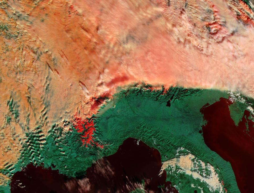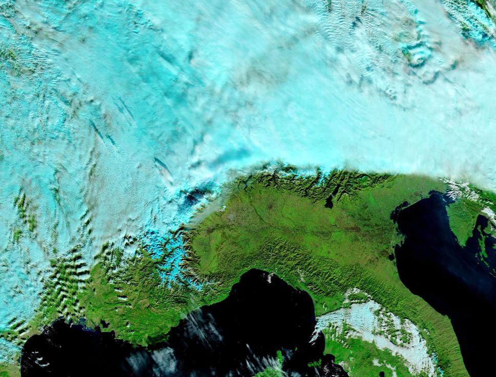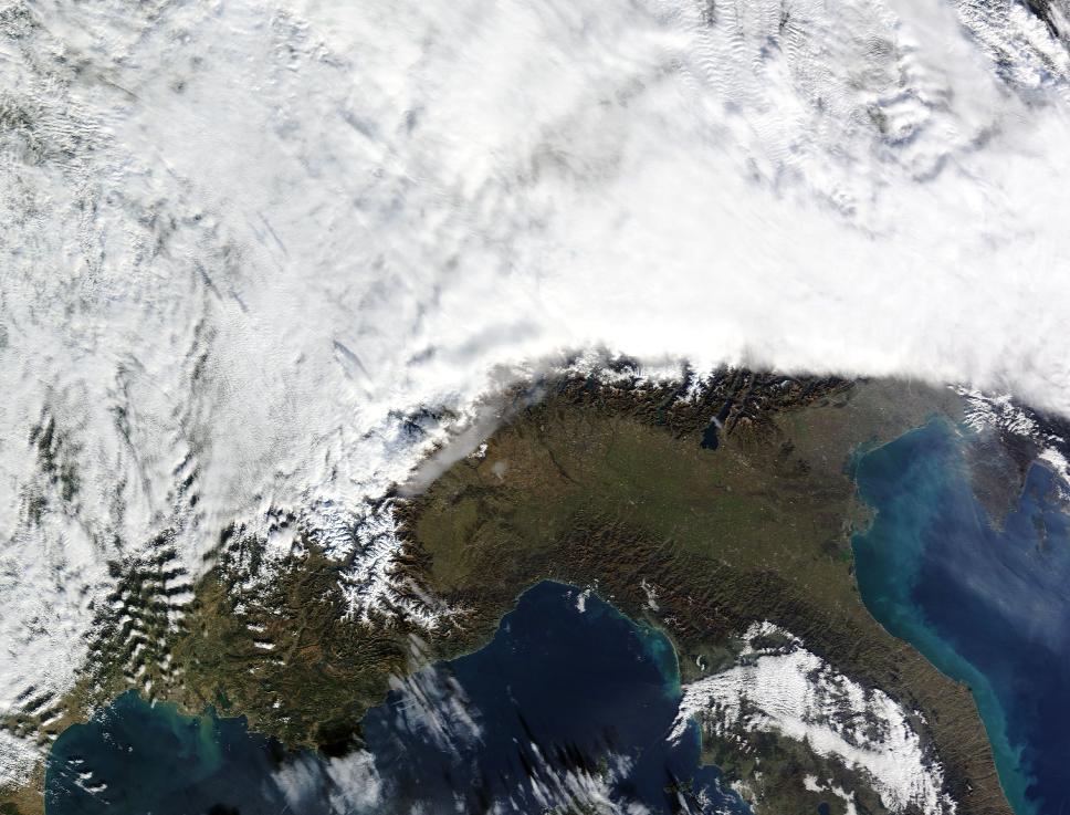 Questa tempesta è stata particolarmente intensa per la furia della Corrente a Getto, il Jet Stream, particolarmente impetuoso dall’oceano Atlantico all’Italia (vedi immagine principale in alto a corredo dell’articolo). Nella giornata di ieri le immagini satellitari hanno fornito un quadro spettacolare dell’impatto del Jet Stream sull’arco alpino, con una forte linea di demarcazione tra le nubi abbassate sul versante settentrionale delle Alpi (da segnalare grandi nevicate in Svizzera, Austria e persino in Alto Adige nei versanti esposti a Nord) con un forte sbarramento proprio sulle cime della catena montuosa che separa l’Italia dall’Europa centrale: