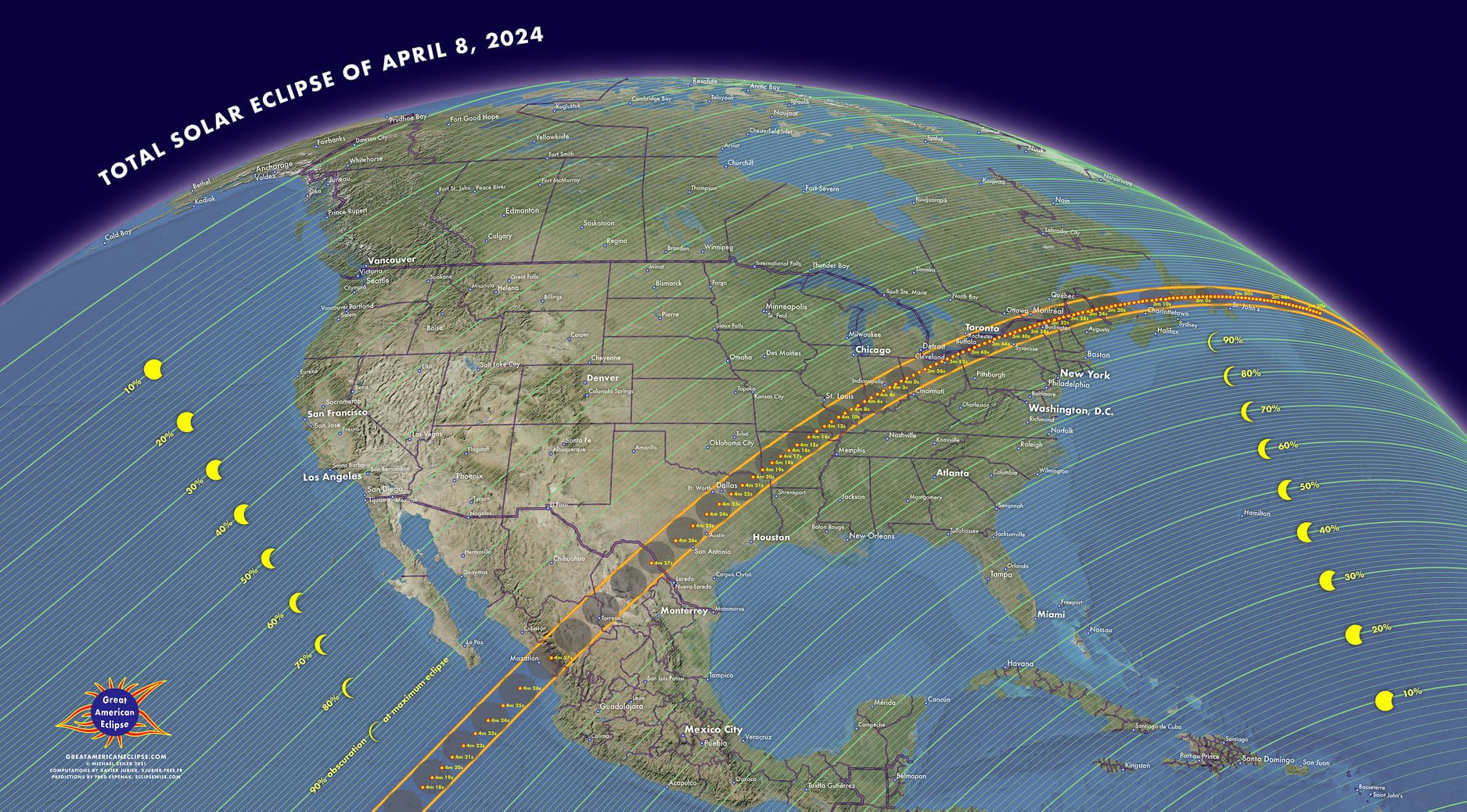 Percorso e Durata: L’eclissi inizierà nel Pacifico orientale e viaggerà in direzione nordest attraverso il Messico, gli Stati Uniti e il Canada orientale. Il percorso di totalità, ovvero le aree dove l’eclissi sarà totale, sarà largo in media circa 120 chilometri.