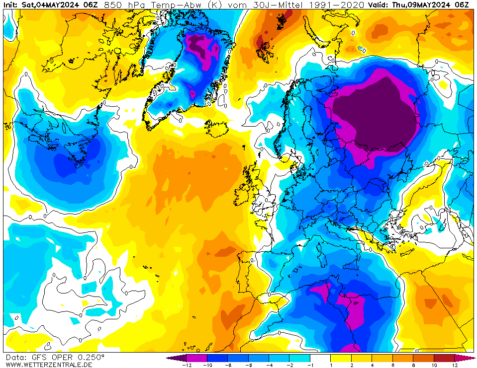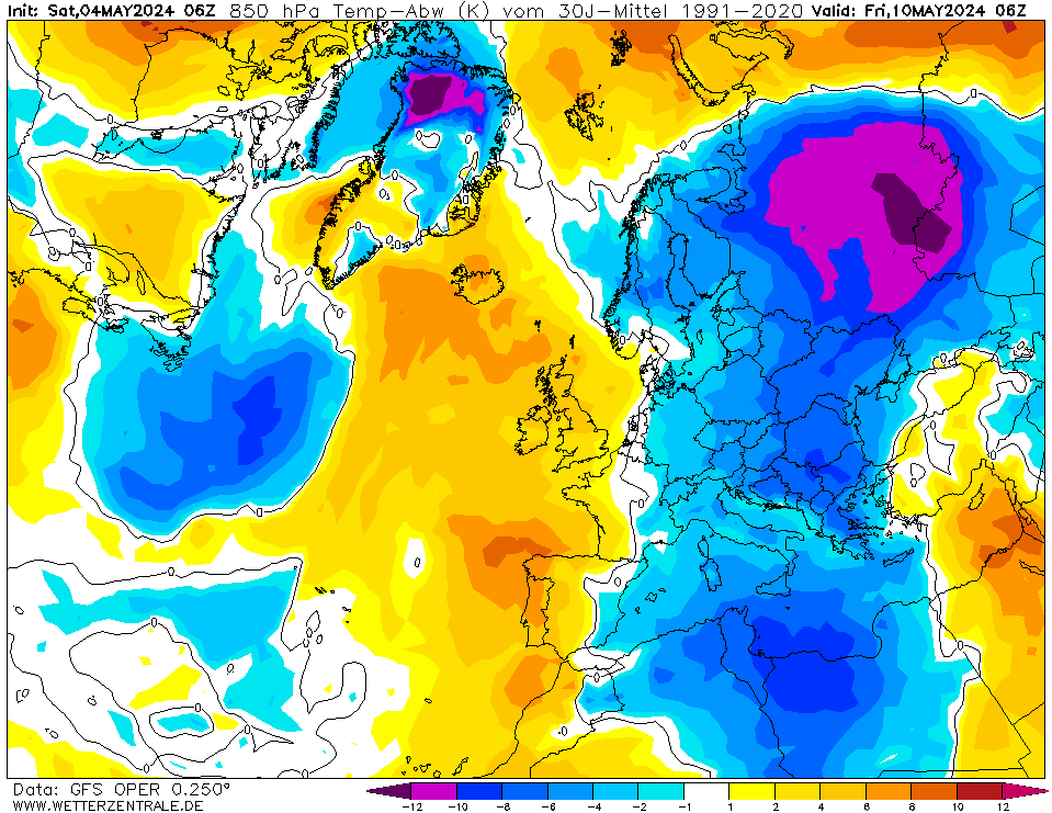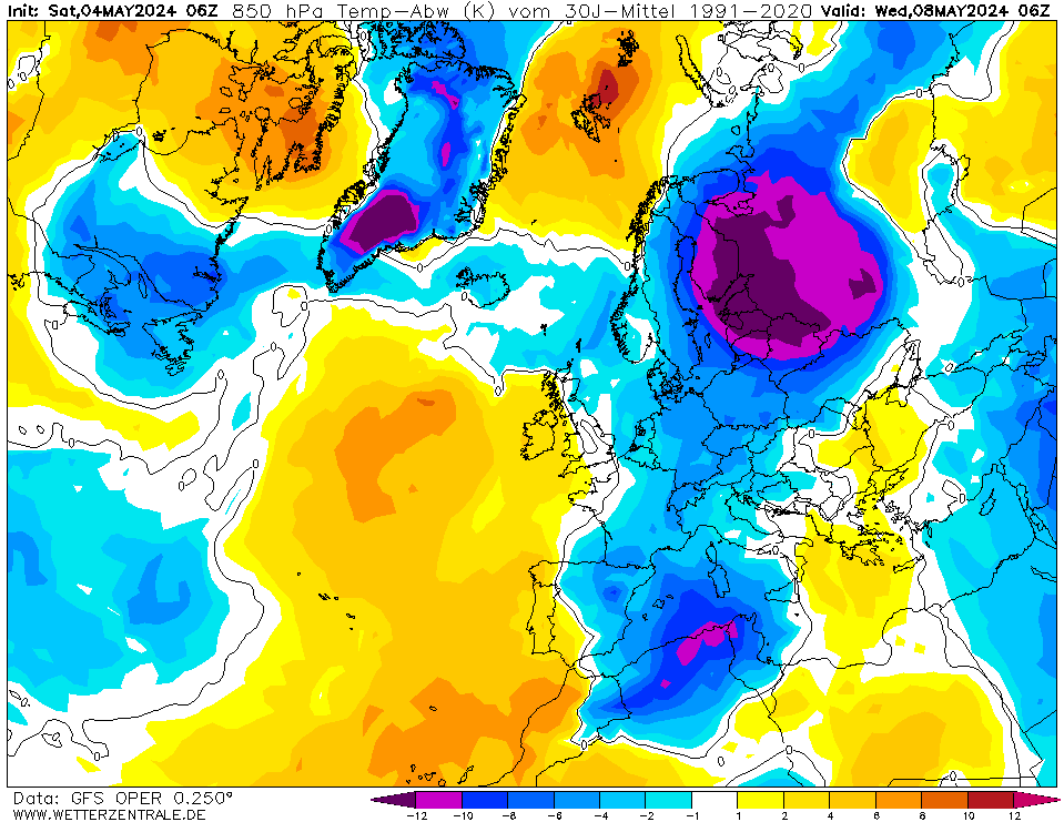 Le anomalie termiche previste per mercoledì 8 maggio: