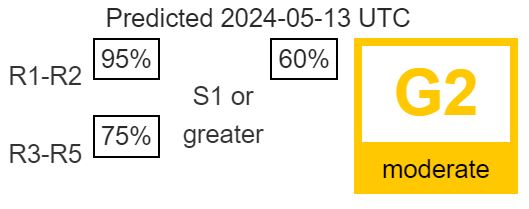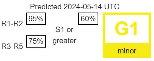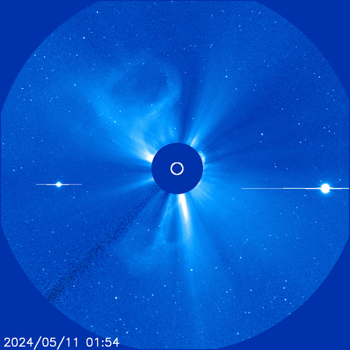 Secondo lo Space Weather Prediction Center della NOAA la grande tempesta geomagnetica che ha interessato la Terra è ormai conclusa. Non c’è alcuna possibilità di ulteriore attività G5 questa settimana perché tutte le grandi espulsioni di massa coronale (CME) hanno raggiunto e oltrepassato il nostro pianeta. Tuttavia, oggi, 13 maggio, sono possibili tempeste di classe G2 in risposta a un colpo di striscio proveniente dalla CME ritratta nelle immagini in alto e di seguito.
