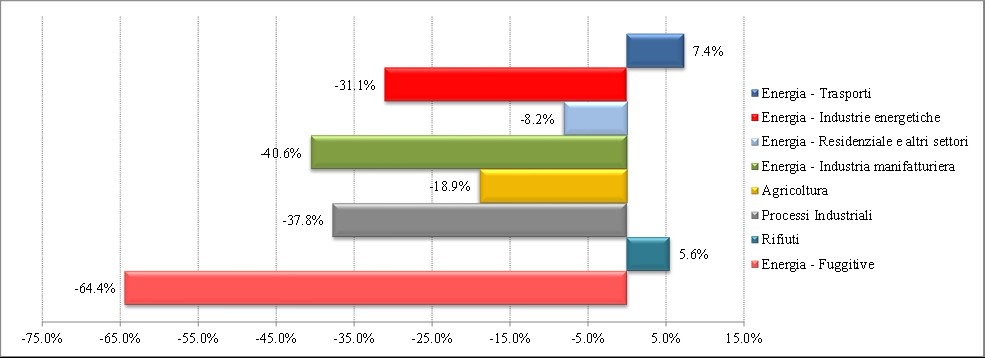 Oltre ai trasporti (26% del totale nazionale), i settori della produzione di energia (23%), residenziale (18%) e dell’industria manufatturiera (13%) sono, nel periodo di riferimento, quelli che contribuiscono a circa la metà delle emissioni nazionali di gas climalteranti.