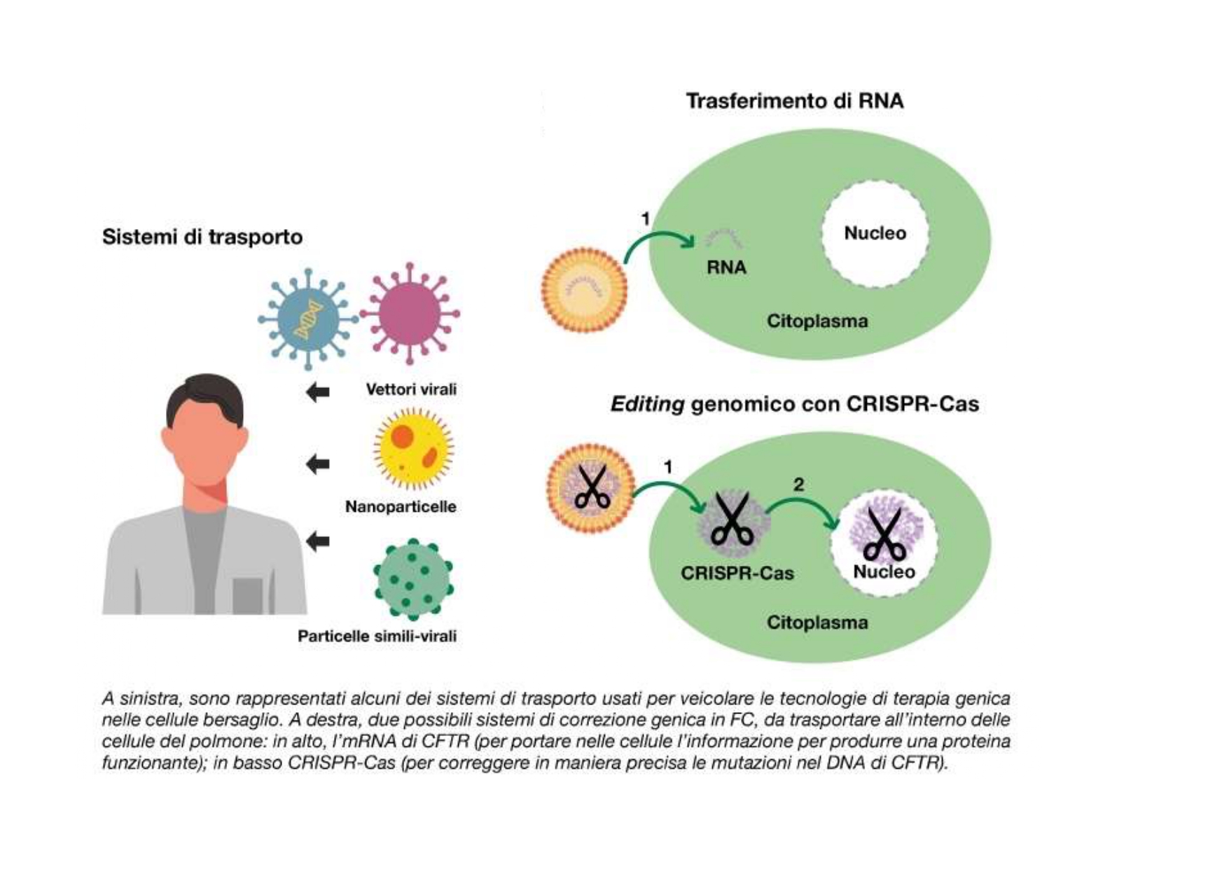 In questo quadro la terapia genica può rappresentare una prospettiva importante per le persone che non hanno ancora un farmaco di riferimento e il progetto GenDel-CF rappresenta in questo senso un passo in avanti ulteriore: invece di sostituire la copia mutata del gene che causa la malattia fibrosi cistica con una funzionante vuole intervenire in maniera precisa solo sulle sequenze di DNA alterate grazie alle nuove tecniche CRISPR-Cas9, od in alternativa fornire molecole di RNA messaggero con la sequenza corretta per produrre proteina CFTR normale. Sono oltre 2.000 le mutazioni del gene CFTR esistenti e circa un malato di fibrosi cistica su tre in Italia ha una mutazione del gene su cui i farmaci oggi non sono efficaci.