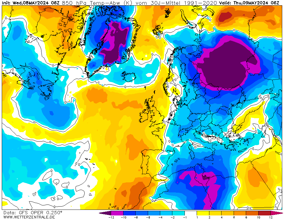 Una vastissima anomalia fredda sta coinvolgendo praticamente tutt’Europa e in modo particolare il Nord-Est del continente. In particolare, nella Russia europea l’anomalia della temperatura a 850hPa raggiunge valori da fondoscala, superando i 12°C in meno rispetto alla norma. Il freddo ha coperto l’intera metà occidentale della Russia: un clima insolitamente freddo per la primavera.