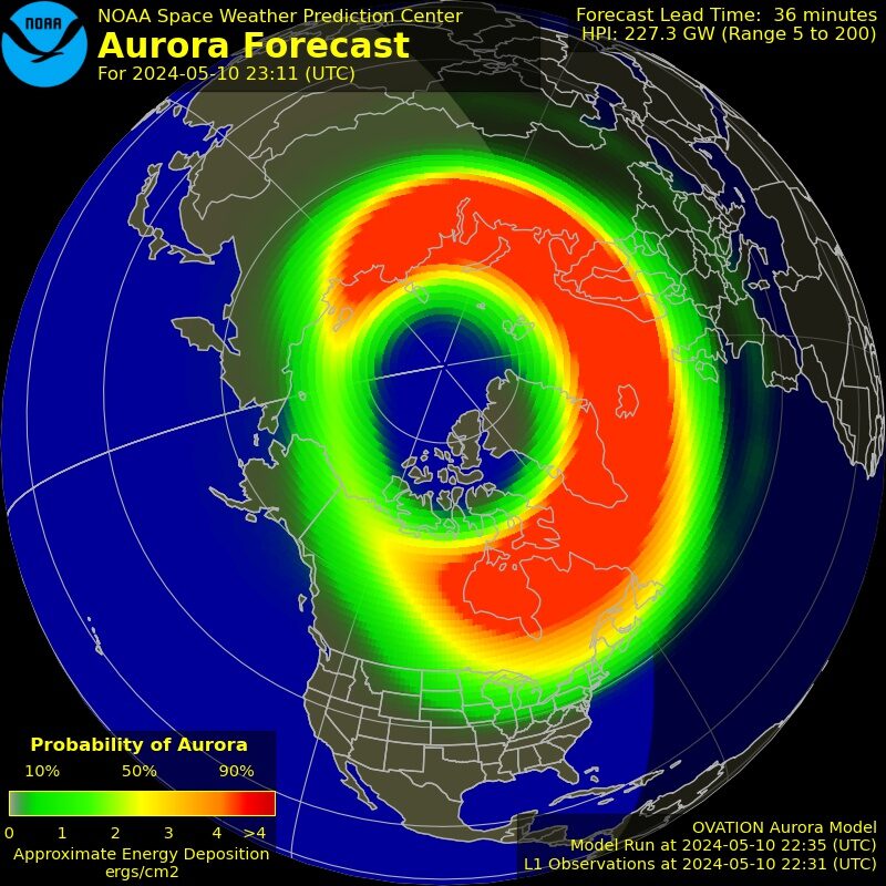 Secondo le ultime previsioni sull’aurora elaborate dall’SWPC, lo spettacolo di luci colorate nel cielo potrebbe presentarsi di nuovo in Italia questa notte. Secondo la mappa, l’aurora potrebbe iniziare ad essere visibile dal Nord Italia tra le 22:30 e le 23, estendendosi fino alle regioni del Centro.