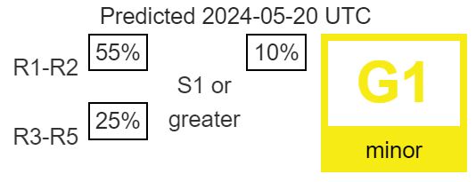 Secondo i previsori dello Space Weather Prediction Center della NOAA, tempeste geomagnetiche classe G1 sono possibili il 19 e/o il 20 maggio in risposta all’arrivo di 2 espulsioni di massa coronale (CME). La CME più potente sarà la seconda, spinta da un potente brillamento classe M7, avvenuto il 17 maggio. Il 20 maggio sarà probabilmente il giorno con maggiore probabilità di effetti geomagnetici.