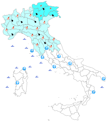 - sparse, anche a carattere di rovescio o forte temporale, su Valle d’Aosta, Piemonte, Lombardia, Triveneto ed Emilia settentrionale, con quantitativi cumulati moderati;