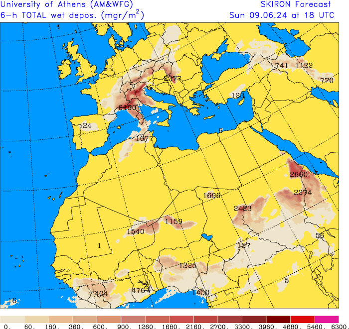 Ancor più impressionante la mappa che illustra i quantitativi di sabbia che cadrà al suolo accompagnata dalle precipitazioni: il Centro/Nord verrà colpito da piogge torrenziali che depositeranno al suolo un enorme quantitativo di polvere proveniente dal deserto africano.
