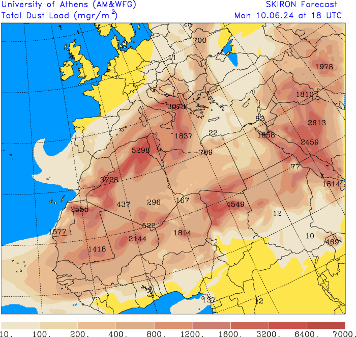 Il maltempo sarà accompagnato da enormi quantità di sabbia del Sahara che risaliranno dal cuore del nord Africa verso l’Italia già nelle ore precedenti. Durante la giornata di domenica 9 giugno, un’enorme nube di polvere desertica avvolgerà l’Italia intera in uno scenario surreale: il sole verrà oscurato dalla sabbia giallastra anche laddove non ci saranno nubi o precipitazioni (al Centro/Sud), come evidenziato dalla mappa che illustra le quantità di sabbia in sospensione nell’atmosfera: