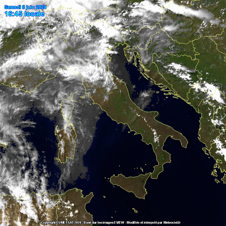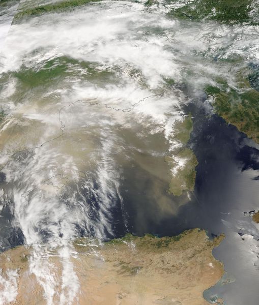 Le immagini satellitari evidenziano lo sviluppo di temporali molto forti in Spagna e in Austria, ma anche la nube di polvere che dal Maghreb risale proprio su Sardegna e Nord Italia: