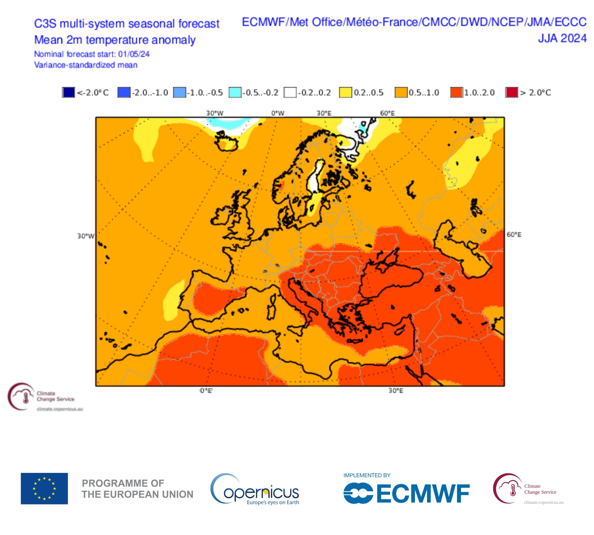 Le previsioni per l’estate 2024 annunciano “una stagione prevalentemente più calda della media su gran parte dell’Europa, anche se i diversi modelli analizzati non sono concordi sulla localizzazione delle aree maggiormente interessate dall’anomalia positiva“.