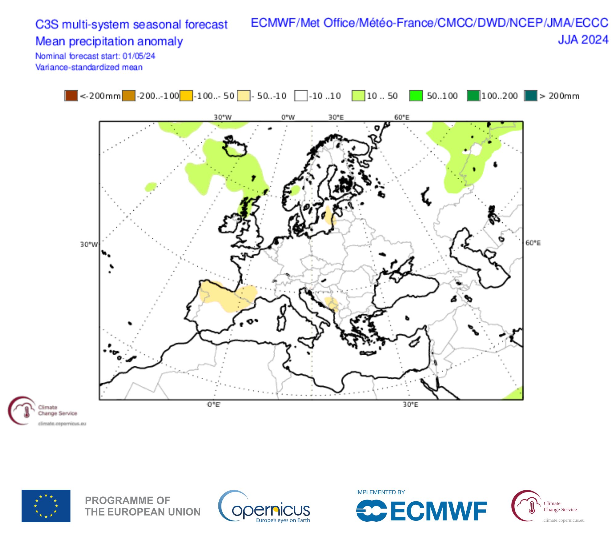 Le previsioni stagionali indicano “un’estate progressivamente più asciutta della norma. Mentre giugno è caratterizzato da precipitazioni ancora lievemente superiori alla media, il prolungamento della lunga fase instabile di maggio, almeno per la prima parte del mese, per luglio e agosto è attesa una progressiva riduzione delle precipitazioni, con valori al di sotto della norma. La scarsità di piogge sul trimestre estivo sembra coinvolgere prevalentemente l’Europa sudoccidentale“, come rappresentato in figura 2.