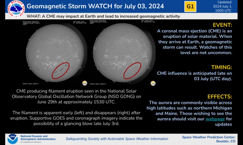 Secondo lo Space Weather Prediction Center della NOAA, il 3 luglio è possibile che si verifichi una tempesta geomagnetica classe G1: domani un’espulsione di massa coronale (CME) dovrebbe sfiorare il campo magnetico terrestre. La CME in avvicinamento è stata scagliata nello Spazio da un filamento magnetico esploso nell’emisfero meridionale del Sole.