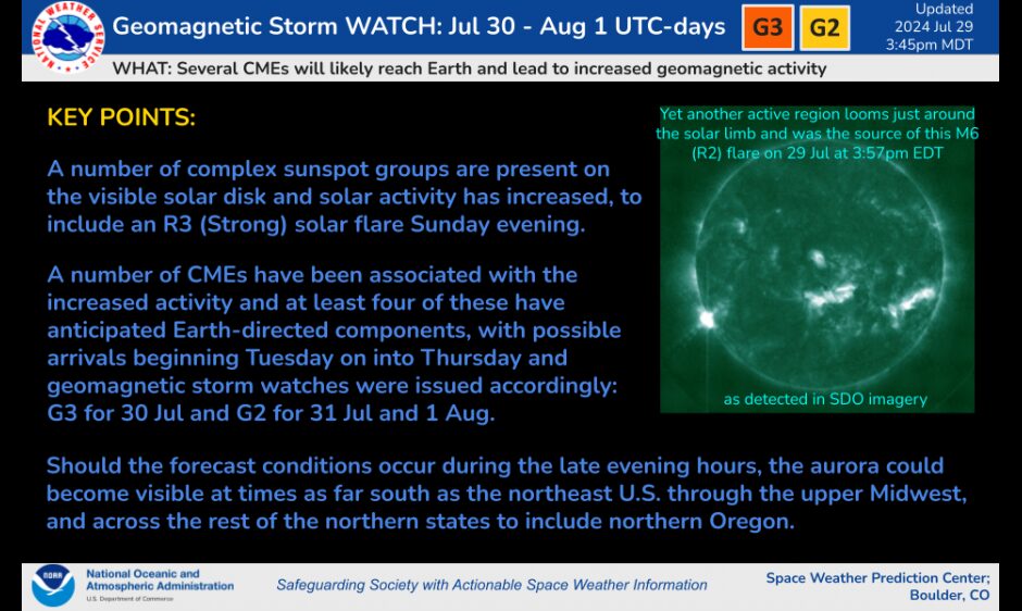 Un’espulsione di massa coronale (CME) ha colpito il campo magnetico terrestre prima del previsto oggi 30 luglio alle 02:30 circa ora italiana. L’impatto “ha innescato una tempesta geomagnetica classe G1 con deboli aurore su alcuni Stati USA settentrionali. Non è questo che ci aspettavamo da una potente CME Cannibale. Infatti, la CME Cannibale potrebbe ancora arrivare“, un modello di previsione dello Space Weather Prediction Center della NOAA suggerisce un impatto nelle prossime ore, con intensificazione fino a classe G3.