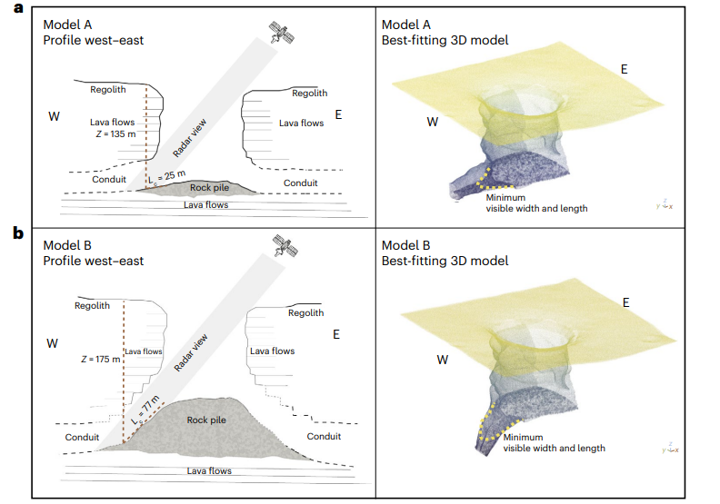 Per confermare questa ipotesi, i ricercatori hanno eseguito simulazioni basate sulle immagini radar. Le simulazioni hanno supportato l’idea che l’aumento della luminosità radar potesse essere spiegato dalla presenza di un condotto sotterraneo. Gli scienziati stimano che il condotto si trovi ad una profondità compresa tra 130 e 170 metri, con una lunghezza tra 30 e 80 metri e una larghezza di circa 45 metri. La struttura della grotta potrebbe essere piana o inclinata fino a un massimo di 45 gradi, rendendola probabilmente accessibile per future esplorazioni.