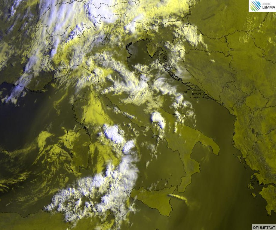 Infatti il Sud Italia è avvolto da una fitta nube di sabbia del Sahara che rende l’atmosfera giallastra, enfatizzando enormemente questa colorazione all’alba e al tramonto quando i raggi del sole penetrano l’atmosfera bassi dall’orizzonte. Le immagini del satellite EUMETSAT di questa mattina all’alba, infatti, sono davvero straordinarie e illustrano – al colore naturale – proprio il giallo della sabbia del Sahara molto diffusa non solo in Italia, ma anche sui Balcani. Al tempo stesso le nubi, che raggiungono quote più alte, si evidenziano per il tipico colore bianco intenso, baciate direttamente dai raggi del sole: