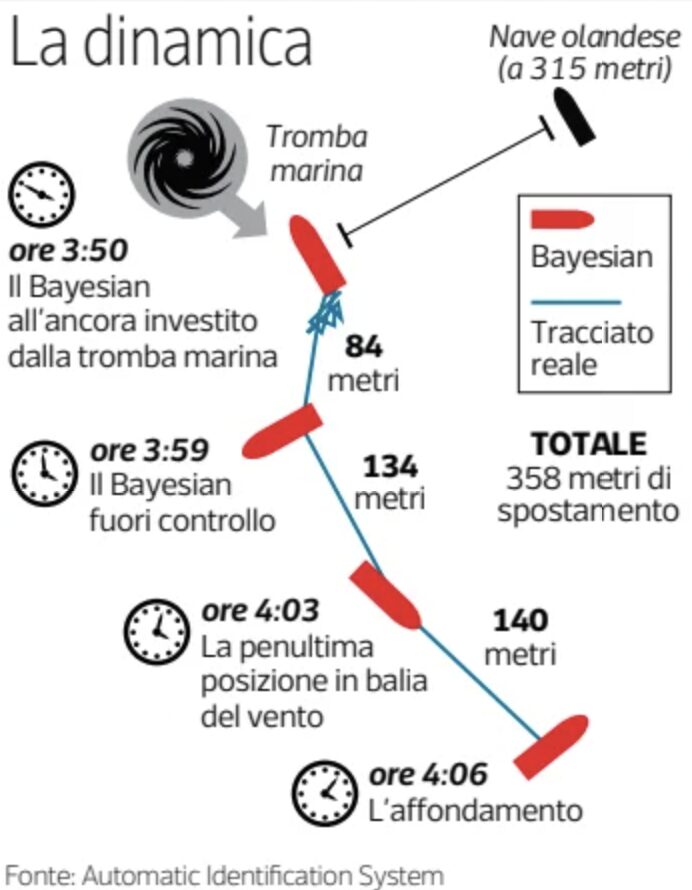 Terza grave fake news quella secondo cui il Bayesian “è affondato in 60 secondi“. Non è andata così. Per affondare, la barca ha impiegato 16 minuti. In 60 secondi, semmai, c’è stato il blackout che ha fatto spegnere tutte le luci dell’albero in quanto l’acqua imbarcata a bordo ha raggiunto i generatori: è un dettaglio fondamentale, che dimostra come la causa dell’affondamento sia stata l’ingresso dell’acqua nell’imbarcazione, affondata dopo aver scarrocciato alla deriva per 358 metri come mostra benissimo il tracciato del AIS, il sistema automatico di identificazione e tracciamento. Il Bayesian era all’ancora, l’errore più grande in questi casi quando bisogna affrontare una tempesta, e infatti appena è arrivato il maltempo ha trotterellato impazzito sul posto. Poi l’ancora si è rotta, ed è andato appunto alla deriva, travolto dal vento. A bordo, nessuno era preparato: i motori erano spenti e la nave ingovernabile. Così è affondata per aver imbarcato troppa acqua.