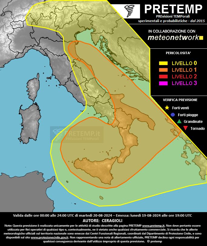 Allerta meteo per forte maltempo oggi 20 agosto in 3 aree: Sud Italia, Regioni Adriatiche e Alpi/Prealpi. In considerazione della situazione, il servizio PRETEMP (gruppo di lavoro che si pone l’obiettivo di studiare e prevedere i fenomeni temporaleschi severi sul territorio italiano) ha pubblicato un nuovo bollettino di previsioni probabilistiche. Di seguito tutti i dettagli e la mappa con le aree a rischio.