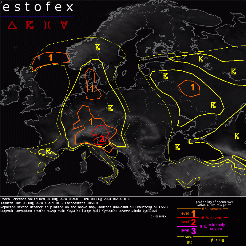Allerta meteo in diverse regioni oggi per forti temporali con rischio alluvioni lampo: è quanto riporta il Centro ESTOFEX (European Storm Forecast Experiment), che ha emesso un avviso valido dalle 8 di oggi, mercoledì 7 agosto, alle 8 di domani, giovedì 8 agosto 2024. In dettaglio, un livello 2 è stato emesso per alcune parti dell’Emilia-Romagna fino al Sud del Veneto e al Golfo di Venezia principalmente per raffiche di vento forti e piogge intense, talvolta eccessive (mappa di seguito); livello 2 per il Sud dell’Austria e l’Ovest della Slovenia principalmente per piogge intense, talvolta eccessive. Un livello 1 circonda il livello 2 per pericoli simili ma con probabilità ridotte, inclusa grandine isolata di grandi dimensioni (valida anche per l’area di livello 2). Le aree di livello 1 in Germania sono state emesse principalmente per grandine isolata, piogge intense e raffiche di vento forti. Un rischio basso di tornado esiste nella Germania centrale occidentale fino al Sud/Ovest della Germania durante le ore serali.