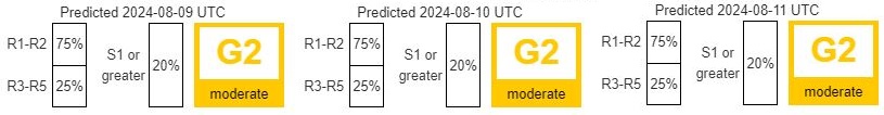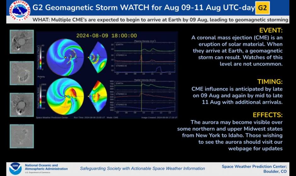 Un nuovo modello dello Space Weather Prediction Center della NOAA mostra 2 espulsioni di massa coronale (CME) che colpiscono la Terra. Il doppio colpo potrebbe innescare tempeste geomagnetiche di classe G2 il 9, 10 e 11 agosto. Il plasma solare è stato lanciato nella nostra direzione da molteplici esplosioni tra le macchie solari AR3774 e AR3777 il 7 agosto.
