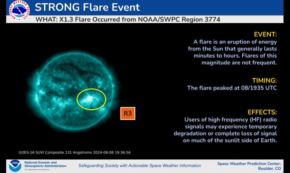 Nel frattempo, il Sole continua a generare forti flare. La macchia solare AR3777 ha appena prodotto il suo brillamento solare più potente di sempre, un’esplosione di classe X1.3 (8 agosto, 21:35 ora italiana), osservato dal Solar Dynamics Observatory della NASA (immagine in alto e di seguito).