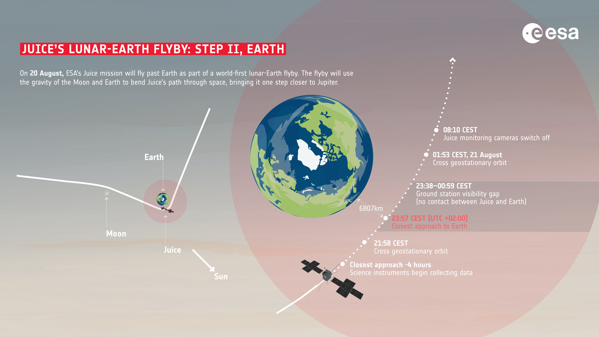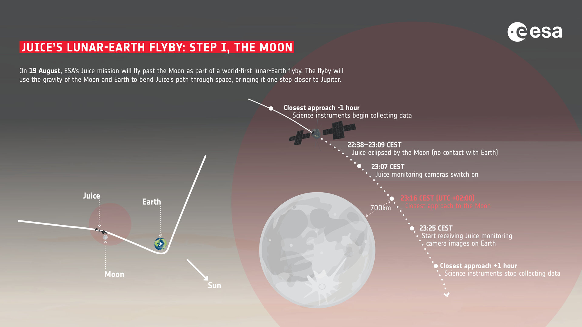 Questa audace manovra, concepita oltre 15 anni fa, richiede una precisione estrema. L’obiettivo è sfruttare l’attrazione gravitazionale prima della Luna e poi della Terra per modificare la velocità e la traiettoria di JUICE, diretta verso Venere. La manovra avrà luogo tra il 19 e il 20 agosto, iniziando con un sorvolo della Luna alle 21:16 UTC del 19 agosto. Successivamente, circa 25 ore dopo, la sonda si avvicinerà alla Terra, che la rallenterà ulteriormente per indirizzarla verso la sua prossima destinazione.