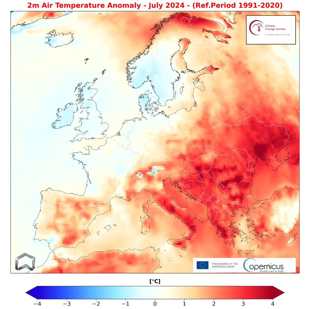 La mappa con le anomalie termiche del mese di Luglio evidenzia proprio come il caldo sia stato confinato al Centro/Sud Italia, comunque senza eccessi particolarmente significativi, mentre al Nord lo scarto dalla norma è stato molto ma molto più contenuto:
