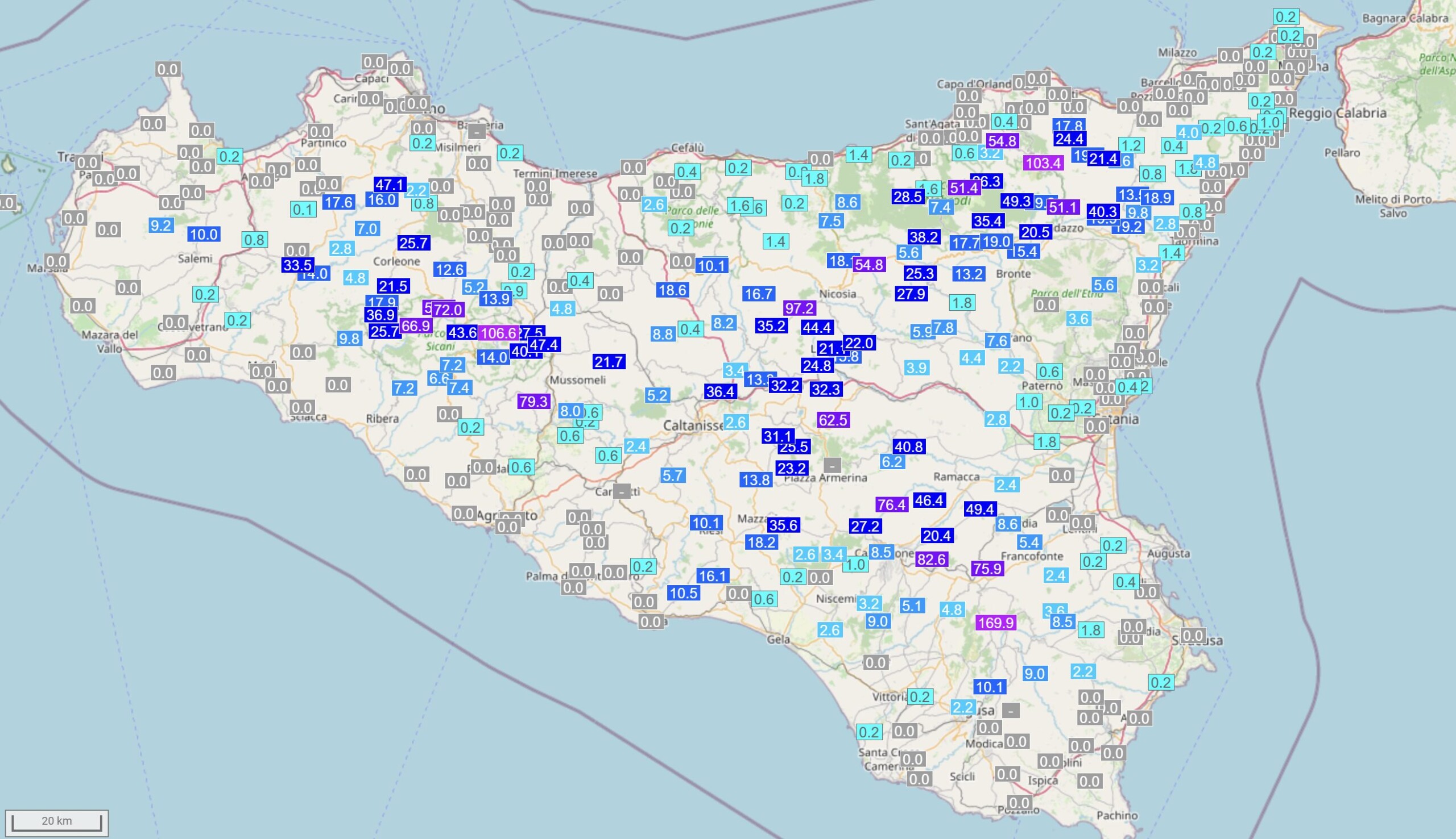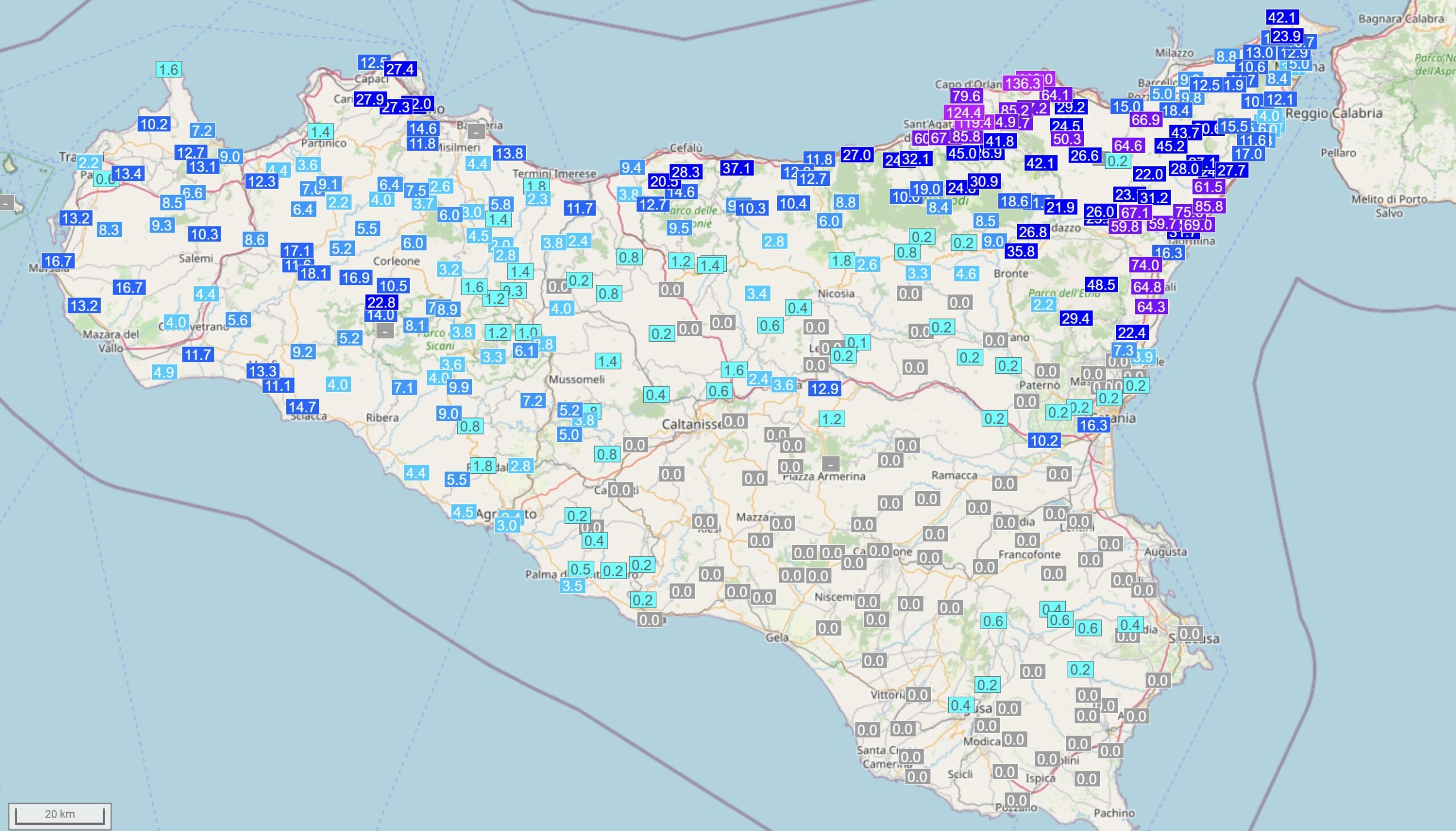 Le mappe con gli accumuli pluviometrici rendono bene l’idea di quanta acqua stia cadendo in Sicilia. Le piogge degli ultimi tre giorni: