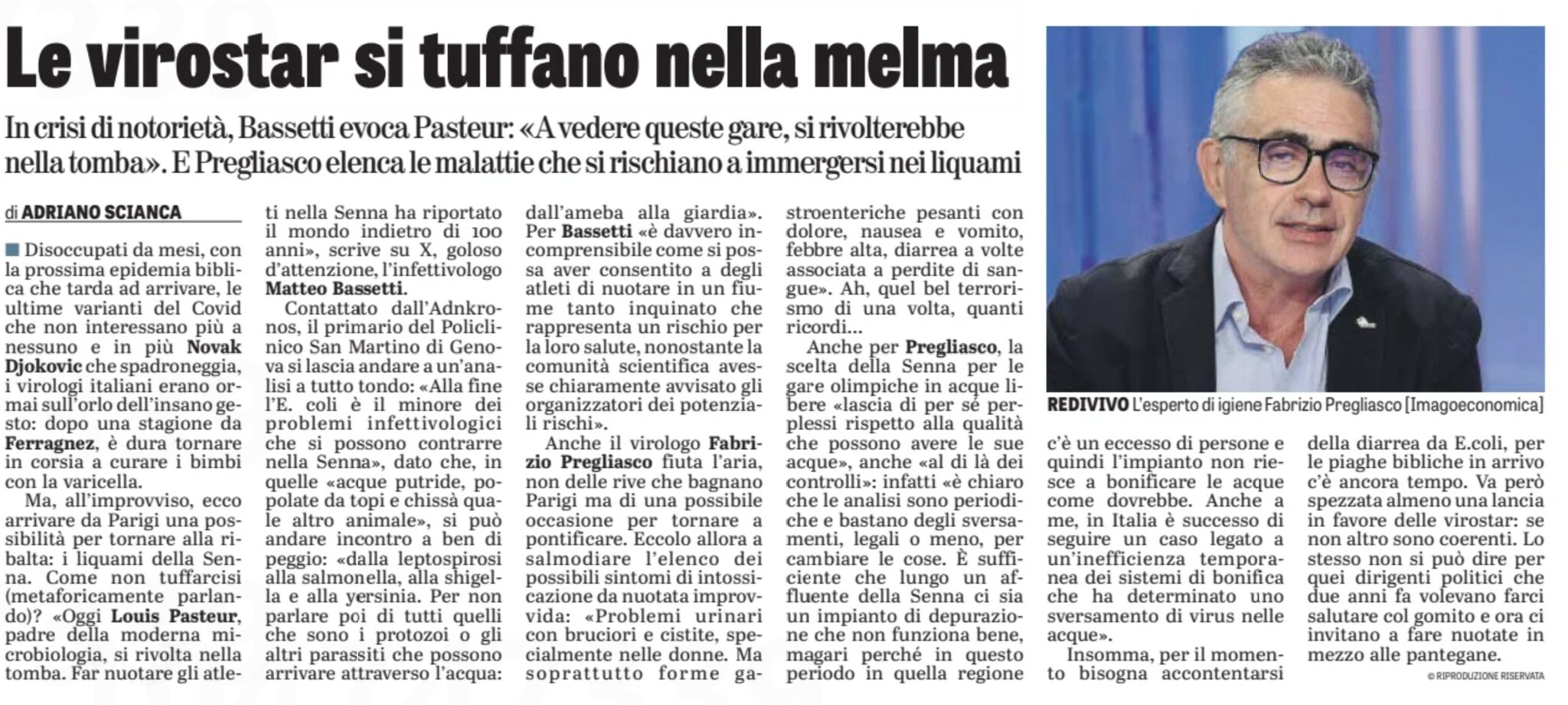 Tono più duro per La Verità, che si sofferma invece sulle virostar: “Disoccupati da mesi, con la prossima epidemia biblica che tarda ad arrivare, le ultime varianti del Covid che non interessano più a nessuno e in più Novak Djokovic che spadroneggia, i virologi italiani erano ormai sull’orlo dell’insano gesto: dopo una stagione da Ferragnez, è dura tornare in corsia a curare i bimbi con la varicella. Ma, all’improvviso, ecco arrivare da Parigi una possibilità per tornare alla ribalta: i liquami della Senna. Come non tuffarcisi (metaforicamente parlando)?”