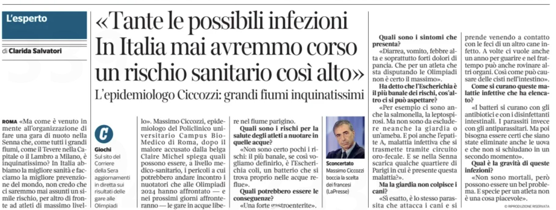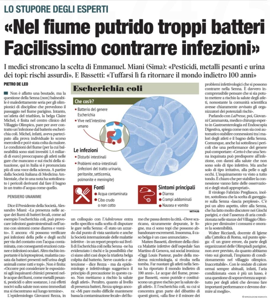 La questione dell’inquinamento e della balneabilità della Senna non è affatto una questione da poco, anzi, è estremamente seria per gli atleti delle discipline che devono immergersi nel fiume parigino. Recentemente, l’atleta belga di triathlon Claire Michel è stata ricoverata nel centro clinico del Villaggio Olimpico, dopo aver contratto un’infezione da Escherichia coli. Le condizioni del fiume, per il quale sono stati investiti 1,4 miliardi (per migliorarne la qualità), preoccupano gli atleti che devono ancora gareggiare. In Italia sono diversi gli esperti che si sono espressi sui rischi associati e le loro posizioni campeggiano sui principali quotidiani.