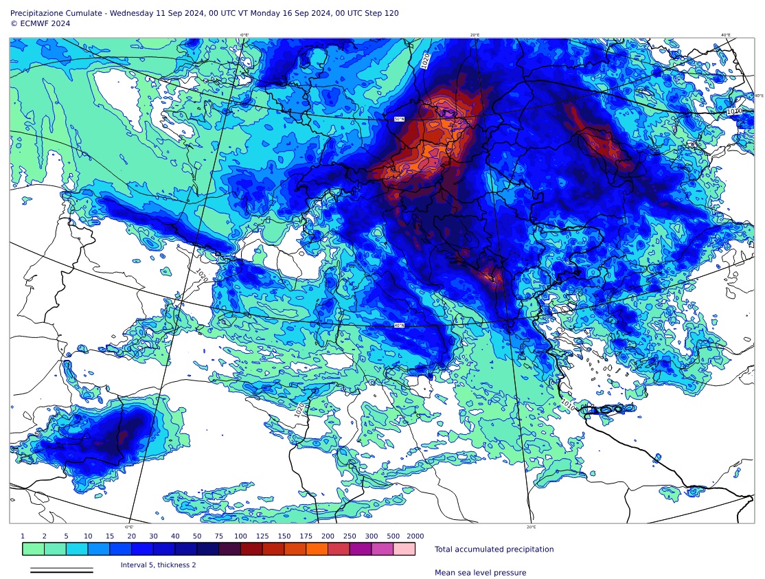 “Ma non sarà solo una diminuzione delle temperature. L’immagine sotto, tratta dal sito web del centro Europeo per le Previsioni a Medio termine (ECMWF), mostra le precipitazioni cumulate da oggi a domenica 15 settembre, quantità non eccezionali ma piuttosto abbondanti”, si legge nell’approfondimento.
