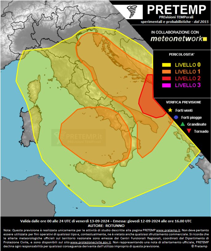 Allerta meteo oggi, 13 settembre 2024, per forti temporali e rischio nubifragi, con rischio trombe marine o tornado, e possibili grandinate. In considerazione della situazione, il servizio PRETEMP (gruppo di lavoro che si pone l’obiettivo di studiare e prevedere i fenomeni temporaleschi severi sul territorio italiano) ha pubblicato un nuovo bollettino di previsioni probabilistiche. Di seguito tutti i dettagli e la mappa con le aree a rischio.