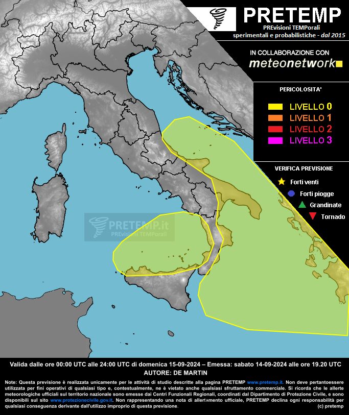 Allerta meteo oggi per “rovesci sui mari centro-meridionali e relative coste, associati a isolate fulminazioni e forse qualche tromba marina“. In considerazione della situazione, il servizio PRETEMP (gruppo di lavoro che si pone l’obiettivo di studiare e prevedere i fenomeni temporaleschi severi sul territorio italiano) ha pubblicato un nuovo bollettino di previsioni probabilistiche. Di seguito tutti i dettagli e la mappa con le aree a rischio.