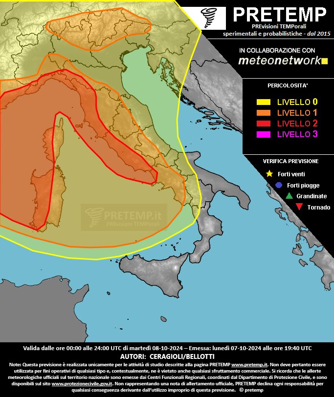 “Una perturbazione atlantica inserita in un pattern da NAO- interesserà gran parte del dominio previsionale nella giornata di martedì 8 ottobre,” spiega PRETEMP. Nella fattispecie “una saccatura transiterà sopra un fronte freddo al suolo guidato da una ciclogenesi sul golfo del Leone in evoluzione verso NE, il quale sarà anticipato da una fase pre-frontale che già durante la notte potrebbe dare inizio alla convezione partendo dai settori occidentali. La saccatura sarà contraddistinta sul lato ascendente da isoipse diffluenti con relativa divergenza in quota che incentiverà la formazione di temporali autorigeneranti in seno ad alcune convergenze al suolo e ad una “warm air advection” riscontrabile sul piano isobarico di 850 hpa ( T-Adv > 8 K/6h),” si legge nel bollettino pubblicato nella serata di ieri e valido per l’intera giornata odierna. “La saccatura sarà inoltre associata ad un atmospheric river (IVT fino a 700-800 kg/m/s) che andrà a forzare i valori di acqua precipitabile (PWAT diffusamente attorno ai 40 mm sul Tirreno). Il rischio principale per la giornata in questione sembra dunque essere quello legato alle piogge abbondanti per le quali viene quindi emanato un livello 2 che copre la maggior parte della fascia tirrenica, mentre un livello 1 vale per forti venti lineari e, al più, per lo sviluppo di fenomeni vorticosi che potrebbero approdare sulla costa, un livello 1 vale anche per grandinate ma in maniera più isolata e soprattutto nella seconda parte della giornata. In Sardegna saranno probabili anche raffiche di vento sempre sotto un livello 2, mentre vale un livello 1 anche per grandinate e forti piogge. Al Nord viene emesso un livello 1 per forti piogge per il fatto che la componente convettiva sarà molto limitata rispetto a quella stratiforme per la mancanza di CAPE”.