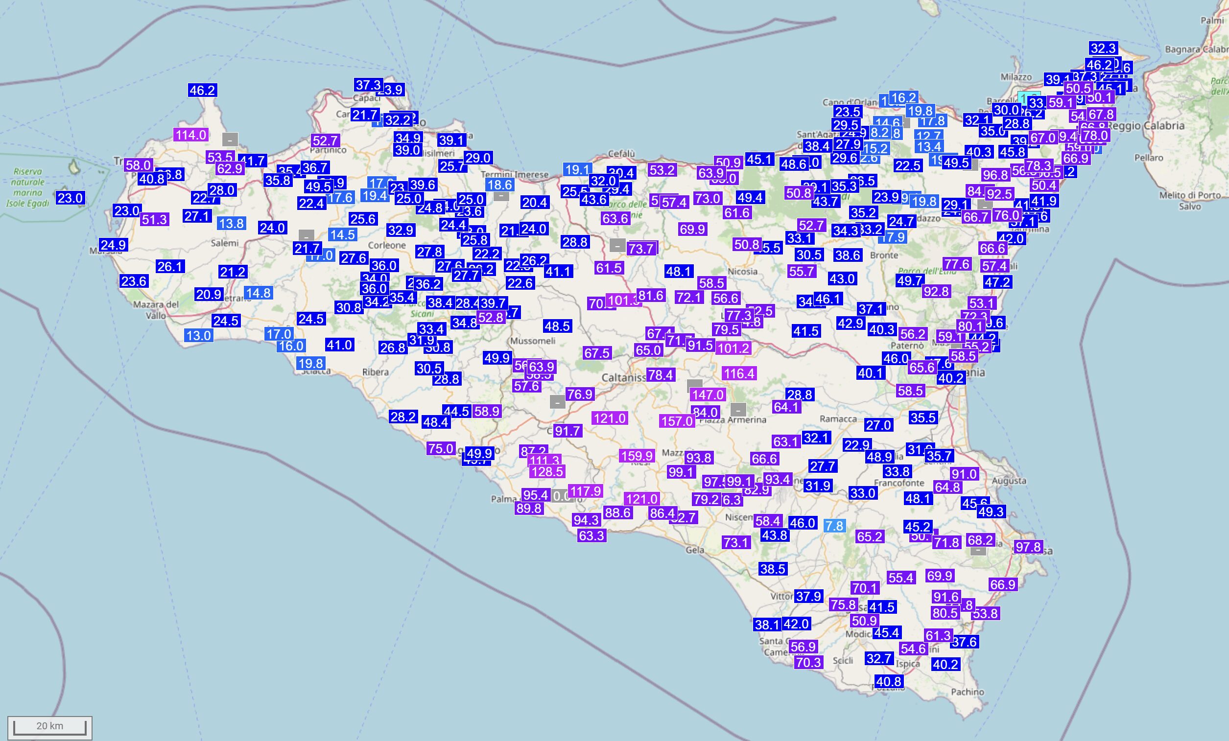 Gli accumuli pluviometrici dell’area sono davvero impressionanti: sono caduti 160mm di pioggia a Riesi, 152mm a Barrafranca, 129mm a Camastra, 125mm ad Aidone, 121mm a Milingiana Sottana e a Ramilia, 118mm a Favarotta, 116mm a Valguarnera Caropepe, 112mm a Naro e a Delia, 110mm a Caltanissetta.