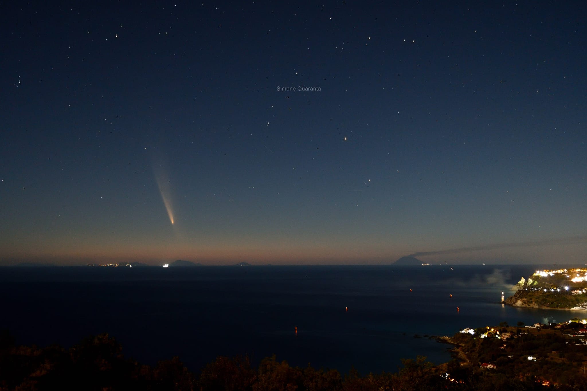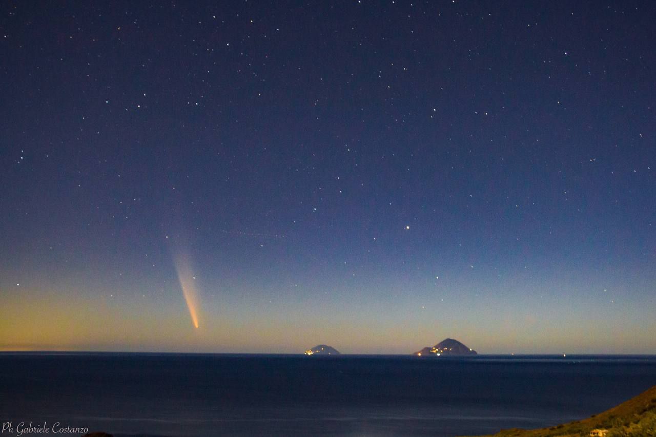 Sempre in Sicilia, Gabriele Costanzo ha immortalato la cometa dalle isole Eolie e tra le isole Eolie, in provincia di Messina, nel basso Tirreno, in uno scenario davvero mozzafiato: