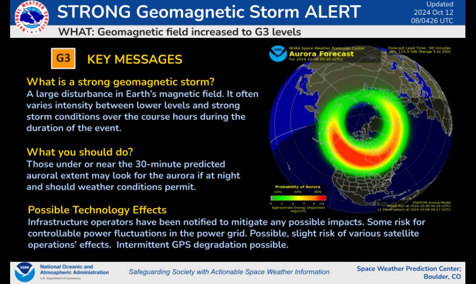 Per la seconda notte di fila, le aurore boreali hanno colorato il cielo degli USA. I livelli di tempesta geomagnetica hanno raggiunto la classe G3 la sera del 7 ottobre ora locale. Cosa è successo? Ebbene, la Terra sta attraversando la coda di una CME che ha raggiunto il pianeta il 6 ottobre, e non è ancora finita: una forte attività geomagnetica è ancora in atto.
