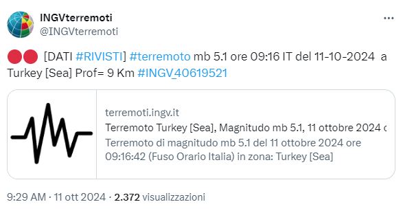 MeteoWeb » GEO-VULCANOLOGIA » Forte terremoto scuote il Mar Nero | DATI e MAPPEForte terremoto scuote il Mar Nero | DATI e MAPPE Non si hanno al momento notizie di danni a persone o cose di Filomena Fotia 11 Ott 2024 | 09:37 / Forte terremoto nel Mar Nero, al largo delle coste della Turchia. L’INGV segnala un sisma magnitudo mb 5.1, avvenuto alle 09:16 ora italiana (10:16:42 ora locale) ad una profondità di 9 km. Non si hanno al momento notizie di danni a persone o cose. Leggi altri articoli di GEO-VULCANOLOGIA