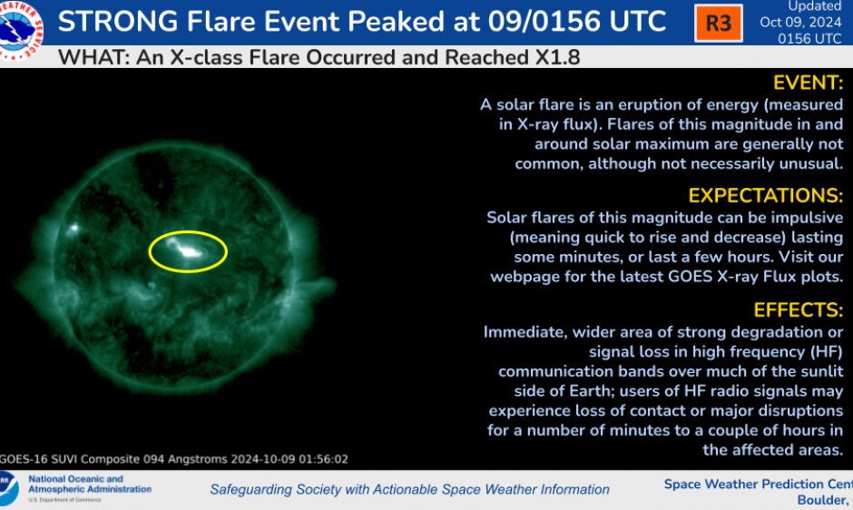 La macchia solare AR3848 era rivolta direttamente verso la Terra oggi, 9 ottobre, alle 03:56, quando ha scatenato un potente brillamento classe X1.8. Le esplosioni sono durate più di 4 ore, così a lungo che hanno generato un’enorme CME. La nube di plasma colpirà sicuramente la Terra nei prossimi giorni, innescando una nuova serie di tempeste geomagnetiche. Sono in arrivo previsioni più precise da parte dello Space Weather Prediction Center della NOAA.